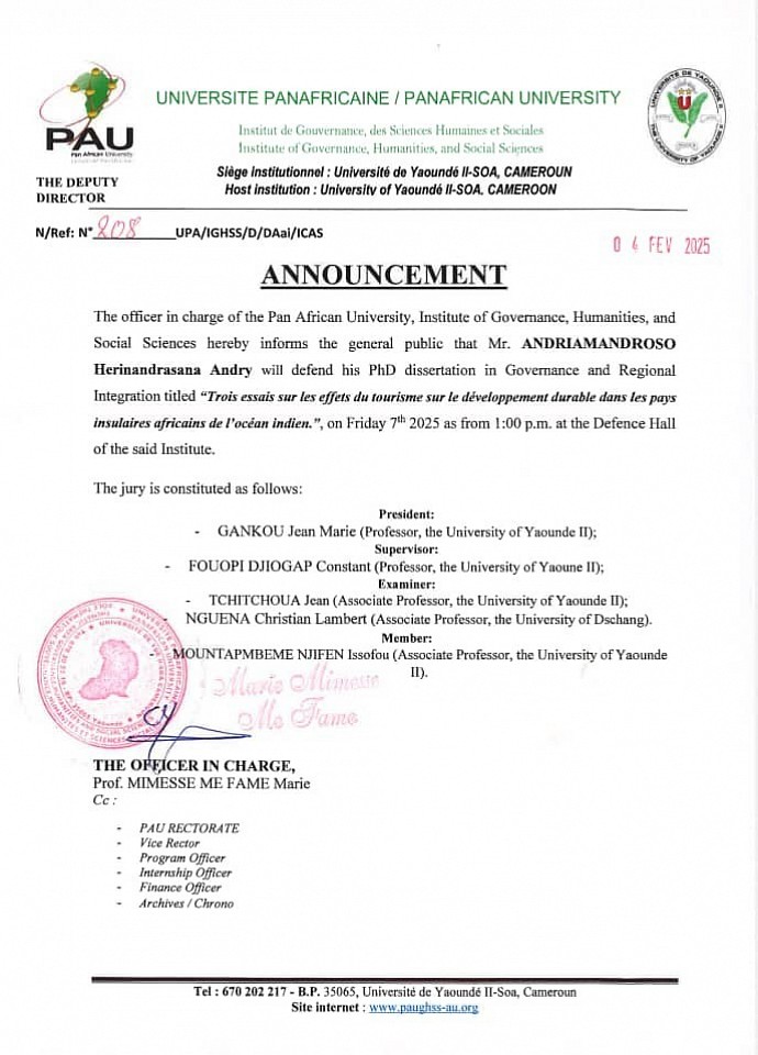 Taking part as an examiner at the Ph.D defense thesis of ANDRIAMANROSO Herinnandrasana Andry in Governance and Regional Integration with the topic entitled "Trois essais sur les effets du tourisme sur le développement durable dans les pays insulaires africains de l'océan indien." On Friday 7th Febuary 2025 as from 1pm